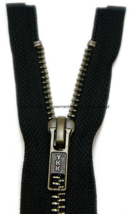Zamek metalowy rozdzielczy YKK. Kolor ząbków i suwaka (maszynki spinającej): mosiądz. Szerokość ząbków spinających po złączeniu: 5mm