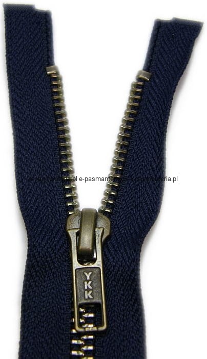 Zamek metalowy rozdzielczy YKK. Kolor ząbków i suwaka (maszynki spinającej): mosiądz. Szerokość ząbków spinających po złączeniu: 5mm