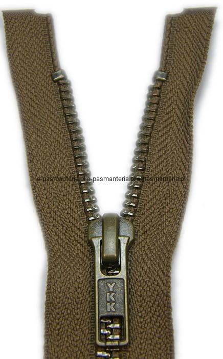 Zamek metalowy rozdzielczy YKK. Kolor ząbków i suwaka (maszynki spinającej): mosiądz. Szerokość ząbków spinających po złączeniu: 5mm