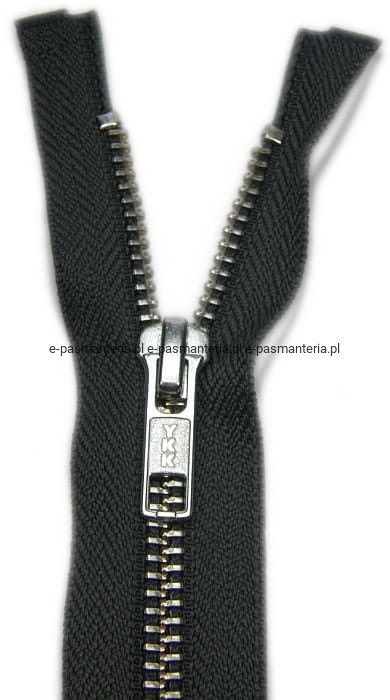 Zamek metalowy rozdzielczy YKK. Kolor ząbków i suwaka (maszynki spinającej): srebrny. Szerokość ząbków spinających po złączeniu: 5mm