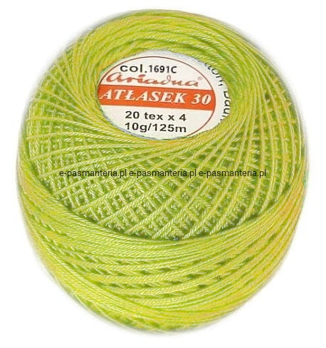 ATŁASEK 30 to lśniąca nitka przeznaczoną do haftu. Nadaje się do wykonywania szwów zdobniczych i innych zdobień oraz wszelkiego rodzaju technik haftów, takich jak: haft płaski, haft Richelieu, haft ze Schwalm.