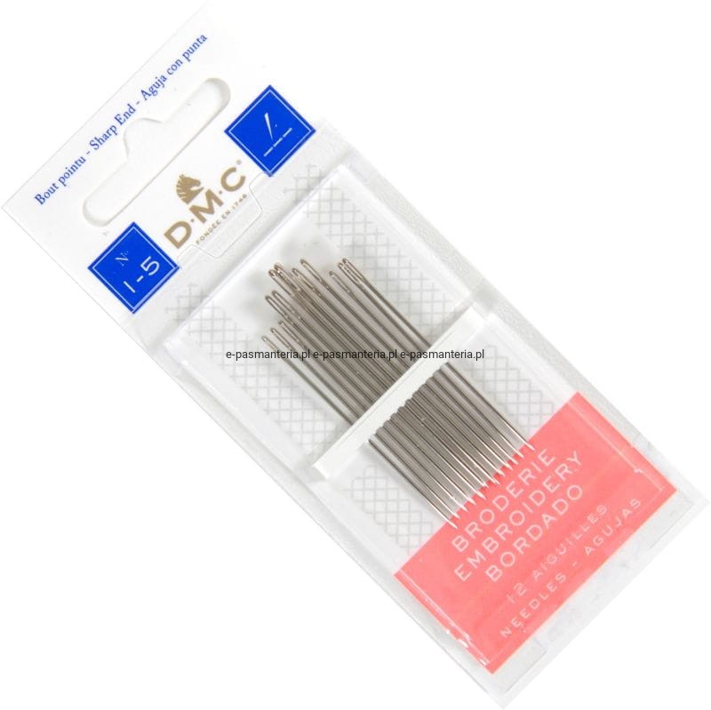 Igły do haftu ostre DMC 1-5". Posiadają smukły korpus i ostre zakończenie, który jest przeznaczone do łatwego przebijania haftowanej tkaniny.