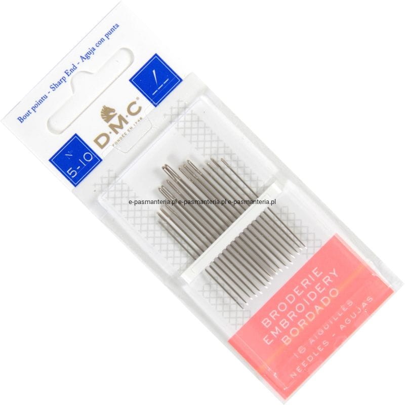 Igły do haftu ostre DMC 5-10". Posiadają smukły korpus i ostre zakończenie, który jest przeznaczone do łatwego przebijania haftowanej tkaniny.