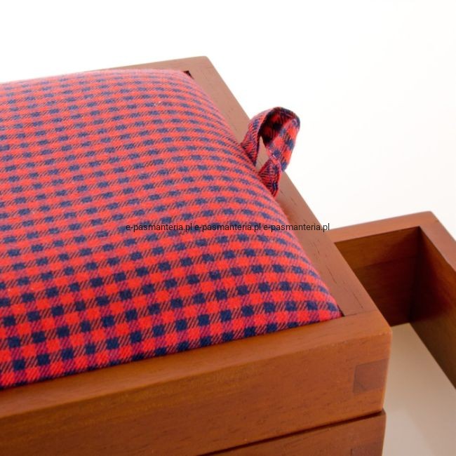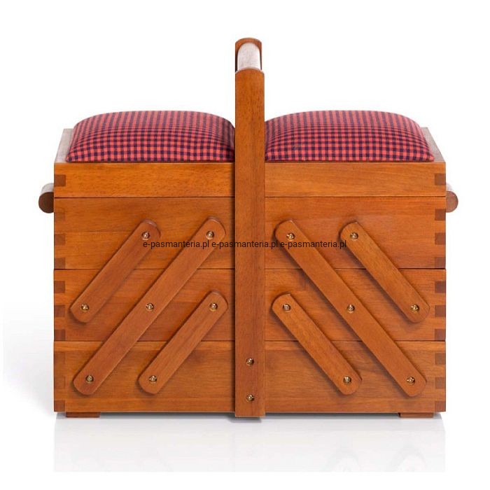 Drewniany, wykonany z litego drewna, przybornik krawiecki posiada pięć półek z czego cztery są rozsuwane piętrowo. Górne wieczka skrzynki są poduszkami krawieckimi, w które można upinać szpilki, igły,  itp. Kolor przybornika:  drewno lakierowane w kolorze teak .