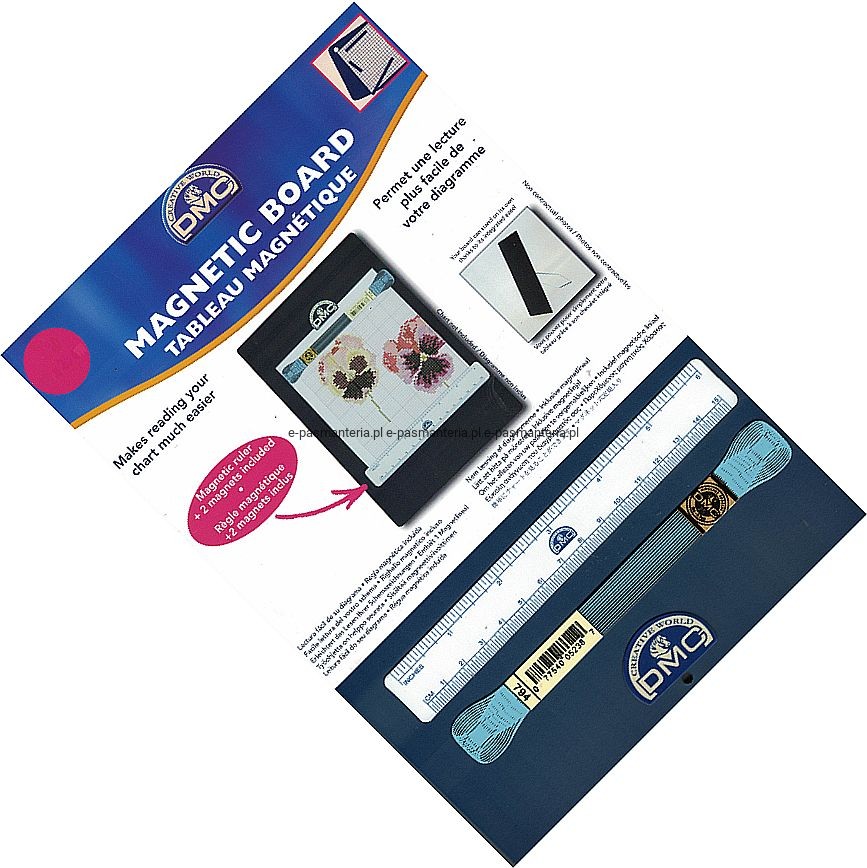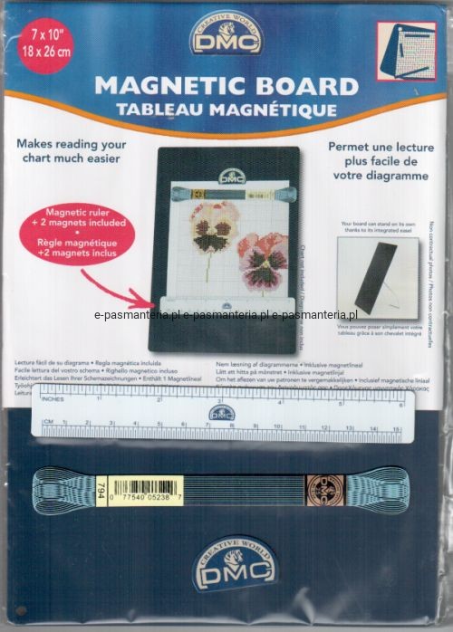 Tablica magnetyczna o wymiarach 18 x 26cm. Do tablicy jest zamontowana na stałe składana podpórka. W skałd wyposażenia tablicy wchodzi: magnetyczna linijka, magnetyczny uchwyt w kształcie muliny oraz magnetyczny znaczek DMC